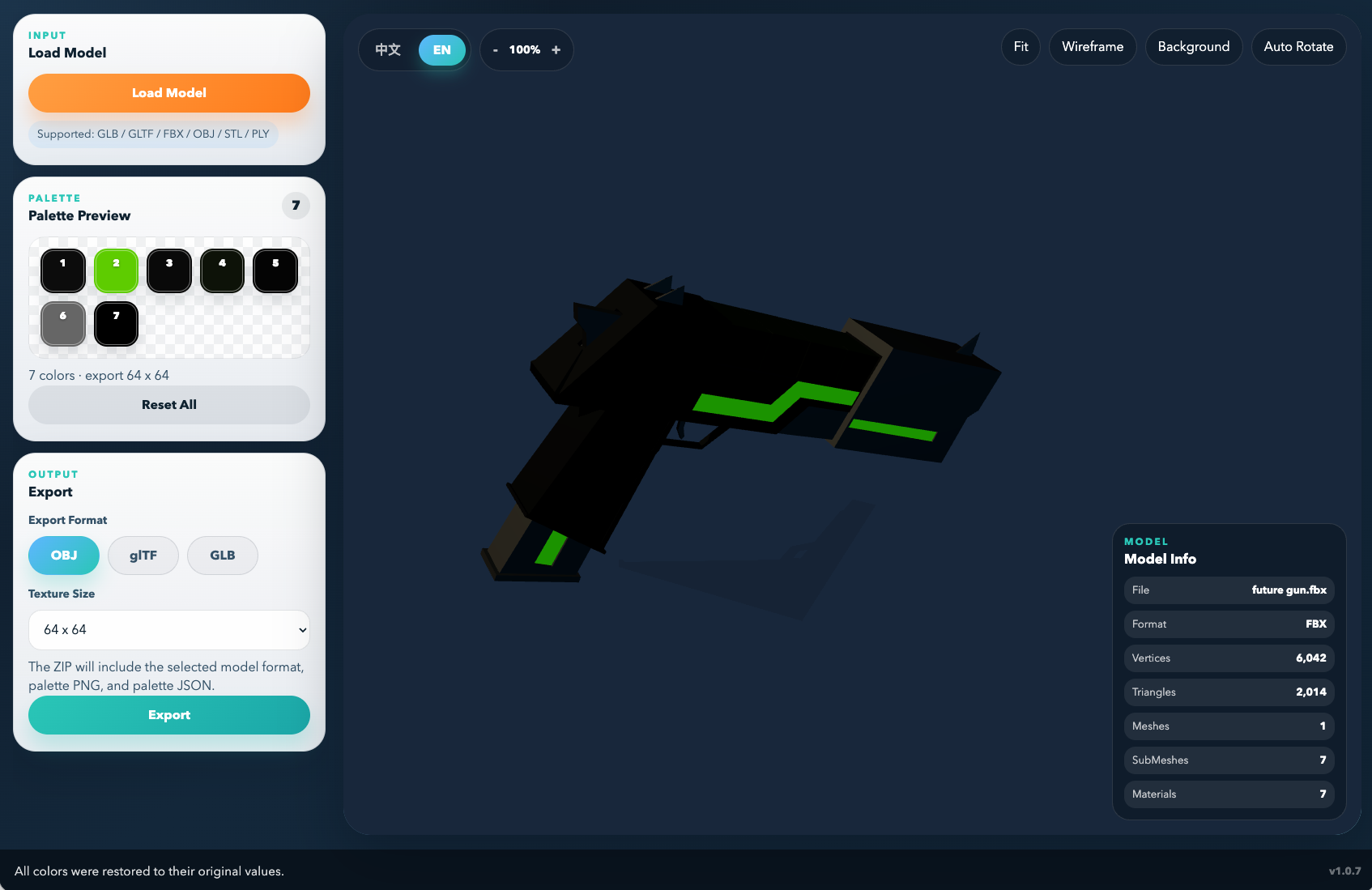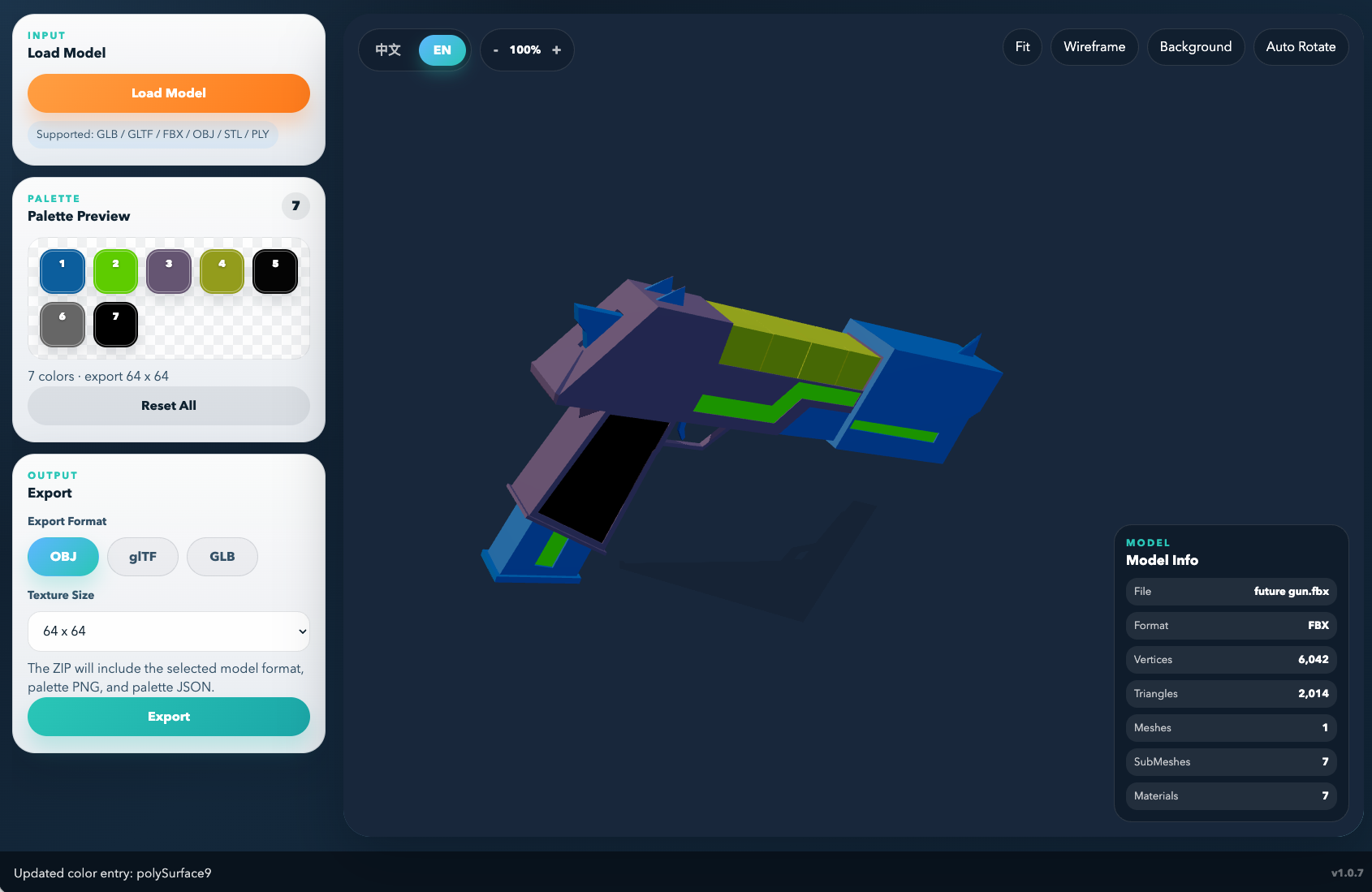 With LowPoly Palette Editor, you can inspect those color-based submeshes, edit their colors directly inside the tool, and convert scattered single-color materials into a more organized palette-based workflow. Instead of keeping a model covered with many separate one-color materials, you can pack those colors into a palette texture and export cleaner, easier-to-manage assets.